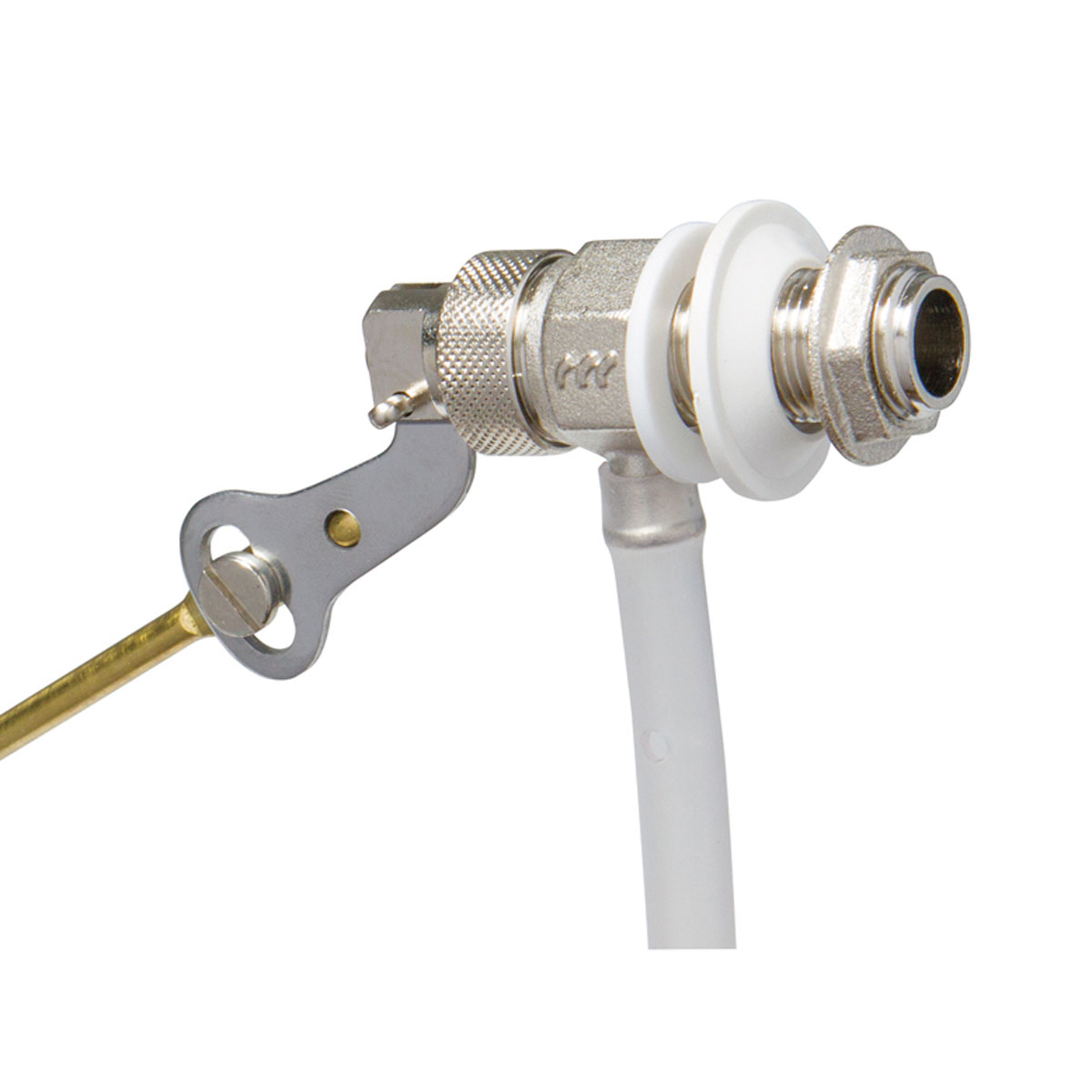 Silent, adjustable brass float angle valve with plastic valve seat and tube.